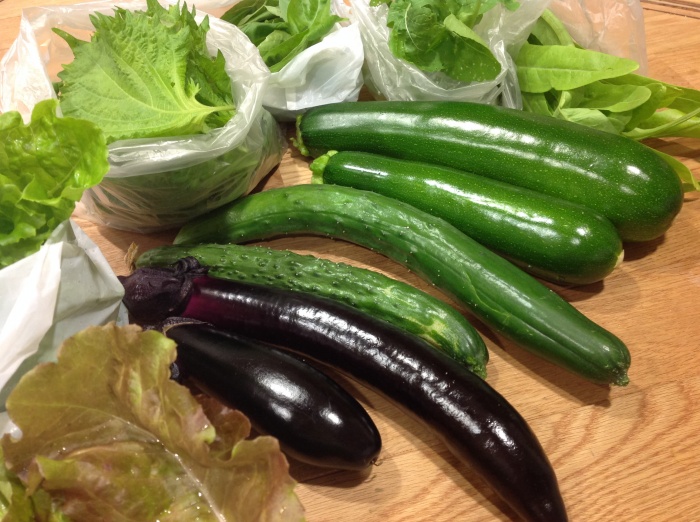 ナス、キュウリ、ズッキーニが大きくみずみずしかったです。