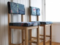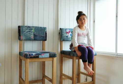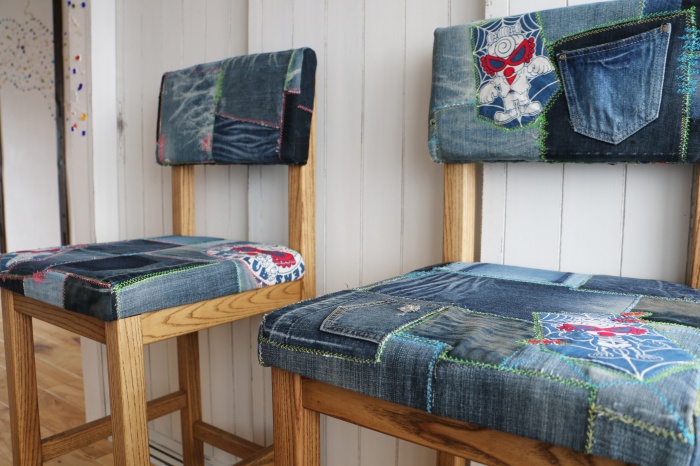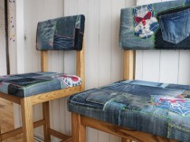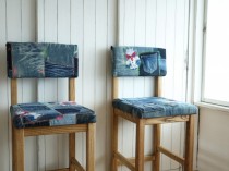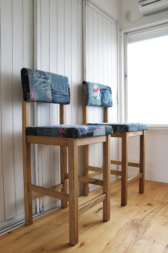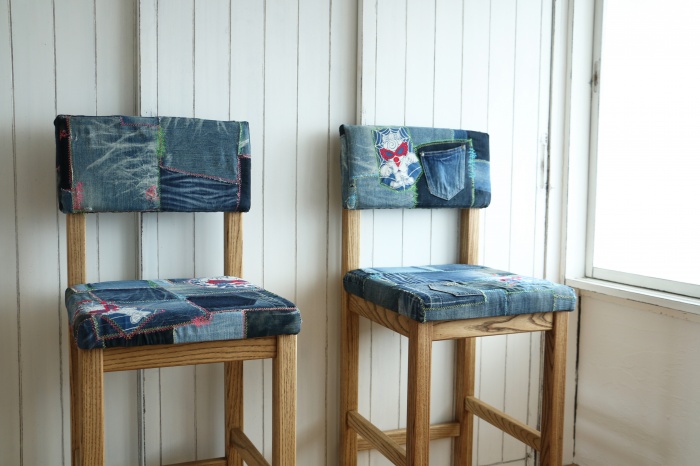 掲載写真のチェアの背もたれ・座席部分の使用布地はお客様ご夫婦の思い出のジーパンを使用しました。カタログもご用意しておりますので、イメージや脚部分の色味と合った布地をお選びいただけます。また、規制布地の指定も承っております。