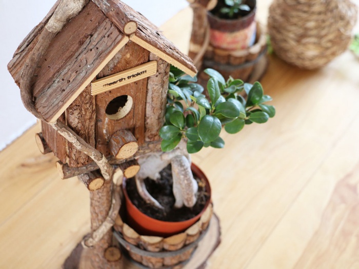 木の質感あふれる鳥小屋がかわいいガーデニングポットです。