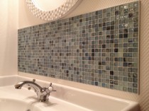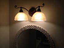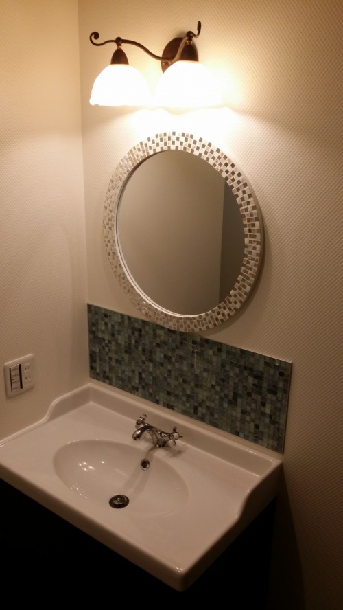 他にも洗面周りの装飾にガラスタイルを使用したことで、清潔感のあるシックな雰囲気になり 落ち着いた照明器具のやさしい雰囲気がプラスされ、まとまりのある空間ができました。